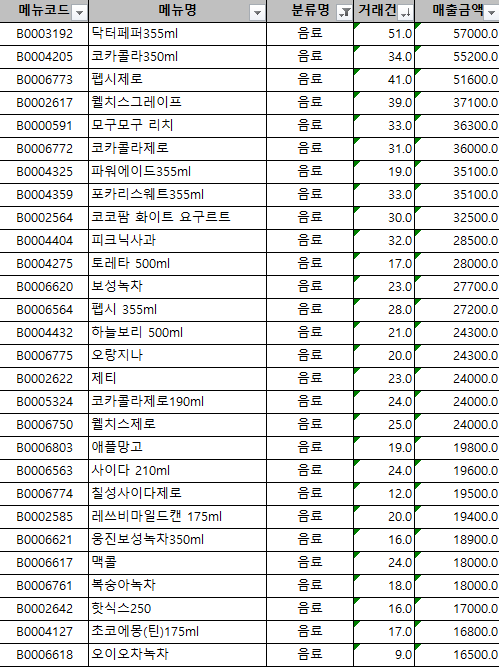 다음은 음료 순위 입니다.