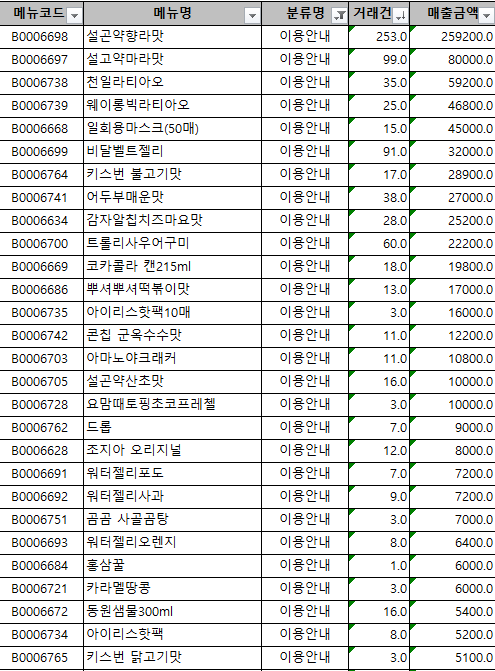 | 무인아이스크림점 매출('22.11.17~12.15) 및 다수 판매 과자 상품 (0) | 2022.12.17 |